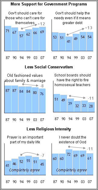 The Pew Research people have been tracking social trends for a couple of decades, and the latest installment suggests that social conservatism ("family values", prayer in schools, and all that stuff) is on the decline, while liberal attitudes (helping poor, etc.) are making a resurgence.