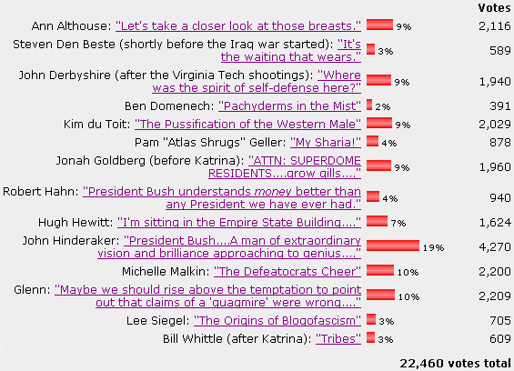 The winner by a substantial margin was John Hinderaker of The Corner for his July 28, 2005 masterpiece containing these words of unforgettable wingnuttery: