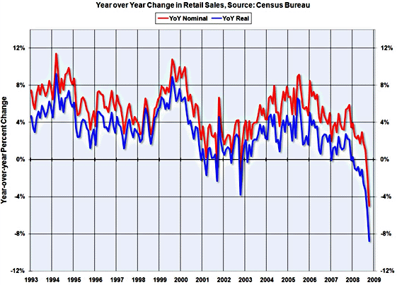 The chart… from Calculated Risk, shows the numbers adjusted for inflation (in blue). Those are the ones that count. Just as it's ridiculous to say that "spending at gasoline stations dropped sharply," as if that's meaningful (people didn't buy less gasoline, after all, they merely benefited from lower prices), it's also ridiculous to claim that overall retail sales were down 4.1% from last year when they were really down nearly 9%. Like it or not, that's a much better indication of how much actual stuff people were buying. (Or not buying, in this case.)