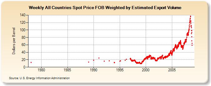 The Price Of Oil Ken AshfordNovember 10, 2008Energy and ConservationLeave a Comment A pretty amazing graph, wouldn't you say? When Bush came into office, oil was at $23 a barrel. It's now just below $60, but was as high as $140 just a few months ago.