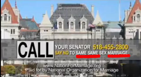 On a related note, the people at the National Organization for Marriage (who provided that wonderful "The Gathering Storm" ad a couple of months ago), have a new ad.  Pay particular attention to the final image (and if you need help), read below the fold.