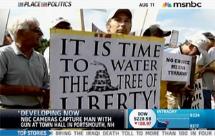 Get this: MSNBC this morning caught a live shot of a man with a gun in a holster. No, he is not a law enforcement person; he's one of the protesters. And the sign he's carrying? It's got that famous Jefferson quote on it: ""The tree of liberty must be refreshed from time to time, with the blood of patriots and tyrants."