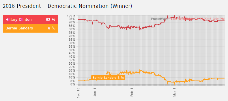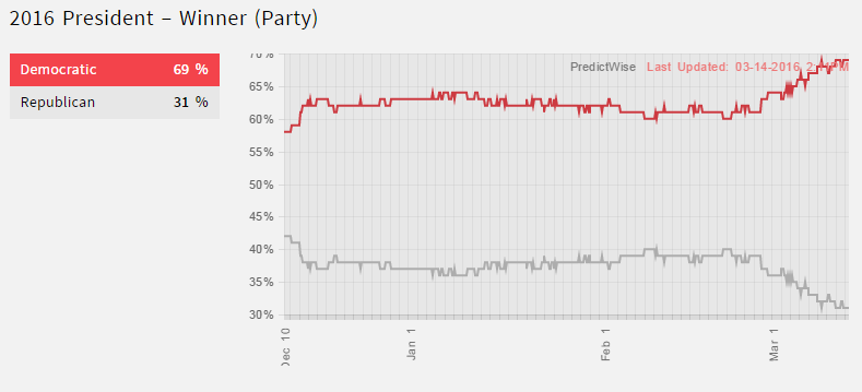 Prediction Markets Say The Primaries Are Over Ken AshfordMarch 14, 2016Election 2016Leave a Comment These are from Predictwise, which is a conglomeration of the online prediction markets and a couple of polls. People put money on this. Click to embiggen. Perhaps we’re already watching a horserace where it is all over.