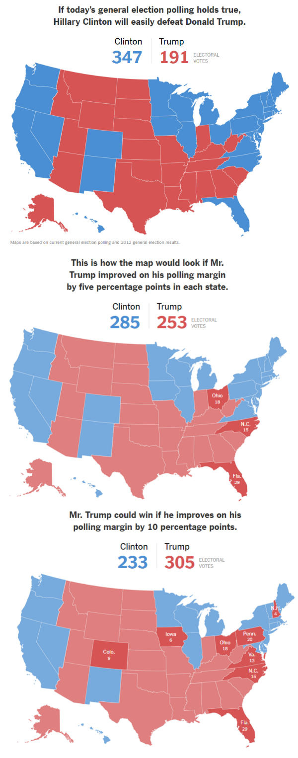 Interestingly, North Carolina is in play. As is Ohio and Florida. This will make vice president choices important. Hillary can sew up Ohio, and take it out of play simply by picking Sherrod Brown as VP. He’ll bring in the Bernie supporters; he’ll bring in Ohio; he’ll bring in blue collar workers.