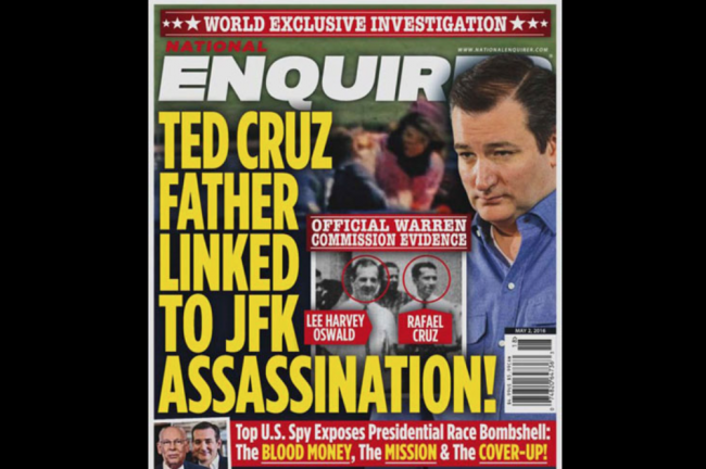 Donald Trump on Tuesday alleged that Ted Cruz’s father was with John F. Kennedy’s assassin shortly before he murdered the president, parroting a National Enquirer story claiming that Rafael Cruz was pictured with Lee Harvey Oswald handing out pro-Fidel Castro pamphlets in New Orleans in 1963.