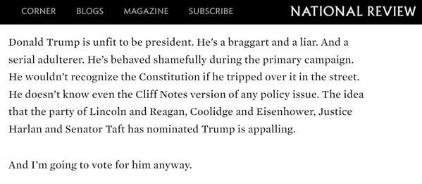 That’s NRO’s Mark Krikorian. And I am left to wonder how much more we will see like that. The title of the article is #NeverHillary, and the gist of his opinion is that Trump, while awful, is still better than the alternative. Fortunately, if you look at the comments section, most of the NRO readers are still in the NO column for Trump.