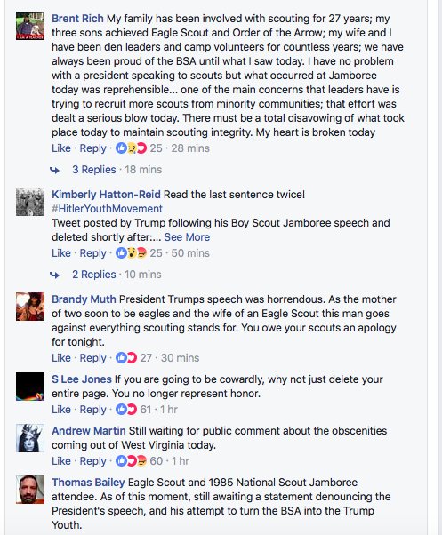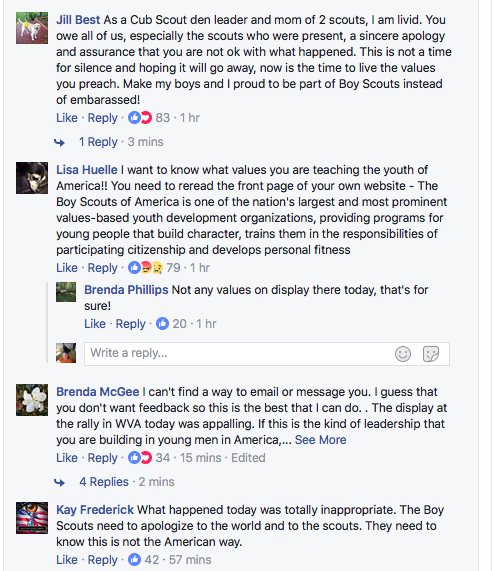 The Boy Scouts are defending the invitation, but so far have not disavowed anything Trump said. This is causing a big backlash everywhere, like on their Facebook page.