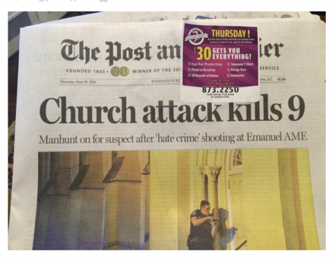 The front page in today’s Charleston, S. C.’s hometown paper: That purple thing is a sticker that went out with the early edition. It’s a little hard to read, but the sticker that partly obscures the headline about a mass shooting advertises the latest deal at a local gun store. “$30 GETS YOU EVERYTHING” — all the goodies needed … Read More