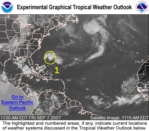 We managed to avoid Dean and Felix, but this one is off our shores: 000ABNT20 KNHC 071515TWOAT TROPICAL WEATHER OUTLOOKNWS TPC/NATIONAL HURRICANE CENTER MIAMI FL1130 AM EDT FRI SEP 7 2007 FOR THE NORTH ATLANTIC…CARIBBEAN SEA AND THE GULF OF MEXICO… THUNDERSTORM ACTIVITY HAS BECOME MORE CONCENTRATED THIS MORNINGWITHIN THE AREA OF LOW PRESSURE LOCATED BETWEEN BERMUDA AND THESOUTHEAST U.S. … Read More